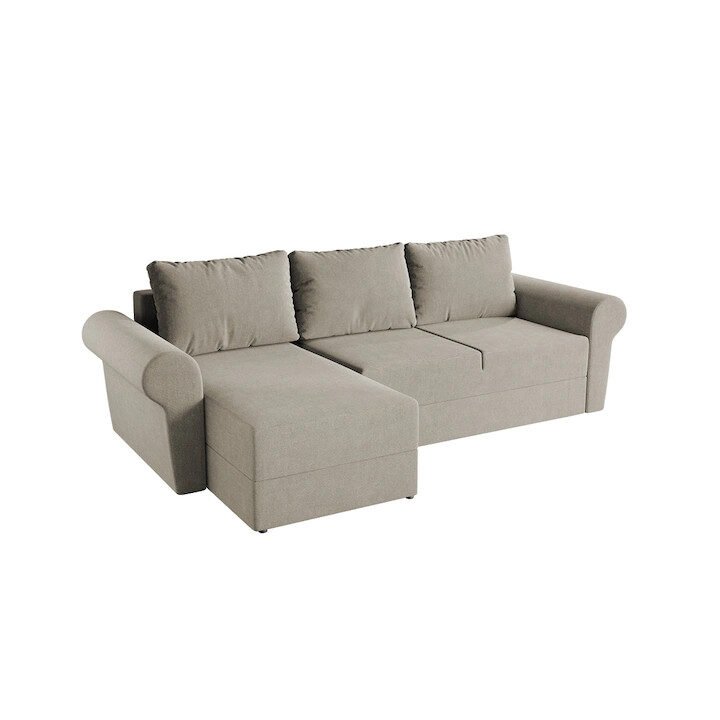 Sensi este un colțar compact, gândit clar pentru spații mici. Este genul de model pe care îl alegi când fiecare centimetru contează, dar vrei totuși funcția de extindere și o ladă de depozitare.